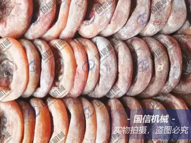 烘干三道工序:再次將柿果放入烘干室,溫度40°C - -45°C 約 10 小時。這個時候已經到了烘干的后段,脫水比較慢。待柿子軟硬一致、富有彈性,含水量在35%左右時,停止烘烤,第三次取出烘好的柿子,堆捂回軟整理形狀。后批柿果按上述方法分批倒換,依次烘干,在不浪費熱量的情況下,提高烘房的利用率。