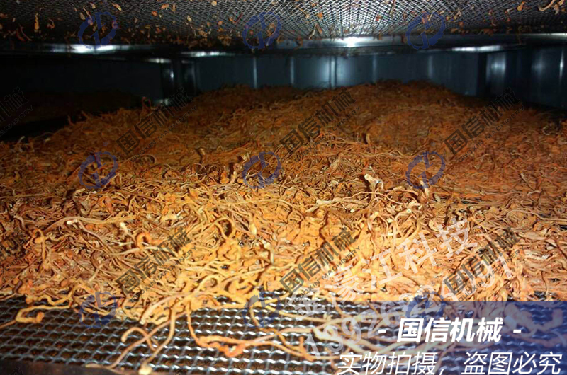 蟲草花烘干機(jī)工藝:初步排水階段:由于剛培育出來的蟲草花含水分含量達(dá)到87%以上,因此,前期需要用35℃左右的溫度,來烘烤3~4小時(shí),先初步的排出一部分水分;